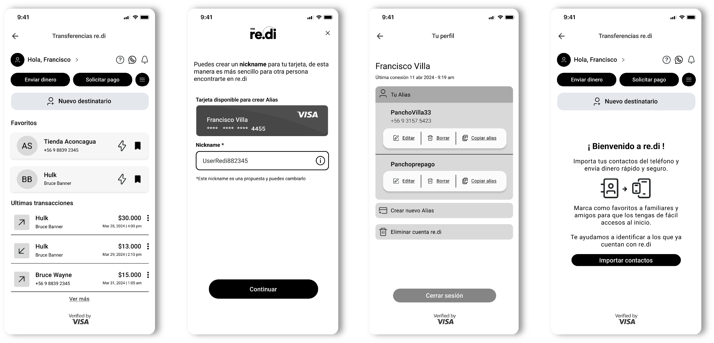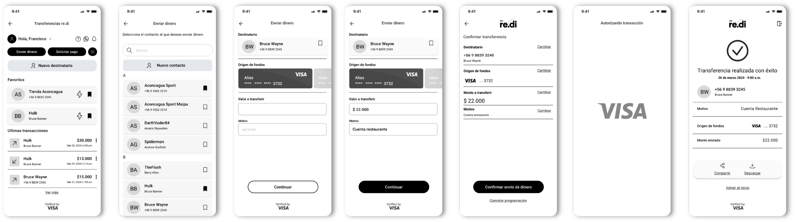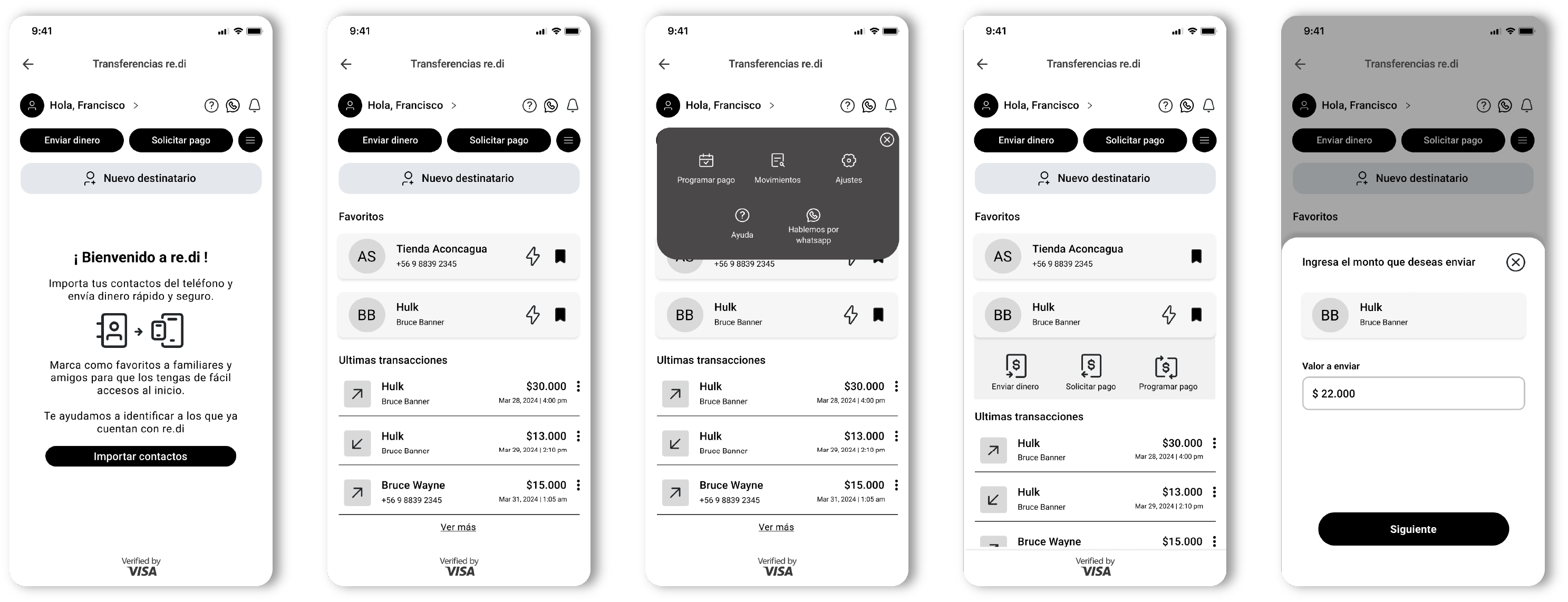 I led the experience exploration and design for "re.di," a proposed modular SDK (B2B2C) by Visa to enable fast, low-friction P2P (Person-to-Person) transfers for its banking partners in Chile. The core challenge was to condense transactional complexity and regulatory requirements into an intuitive, rapid, and easily integrable UX within existing bank applications. The key deliverable was a set of low-fidelity wireframes that served as a strategic product proposal and flow architecture blueprint.